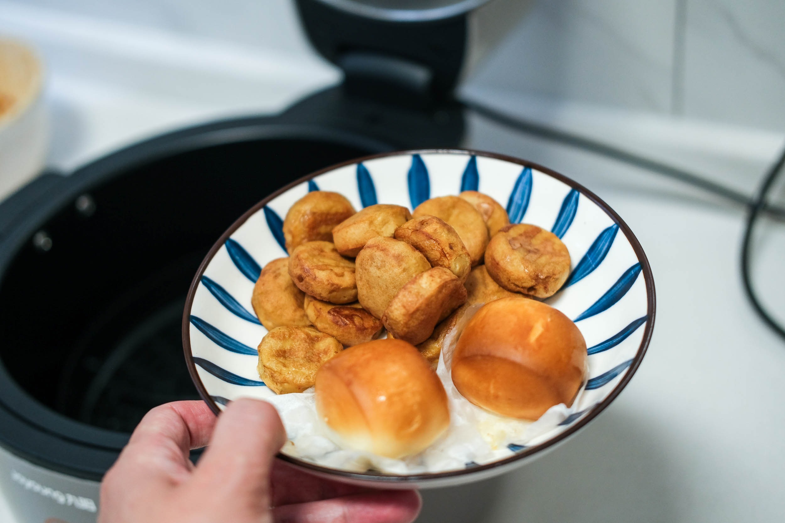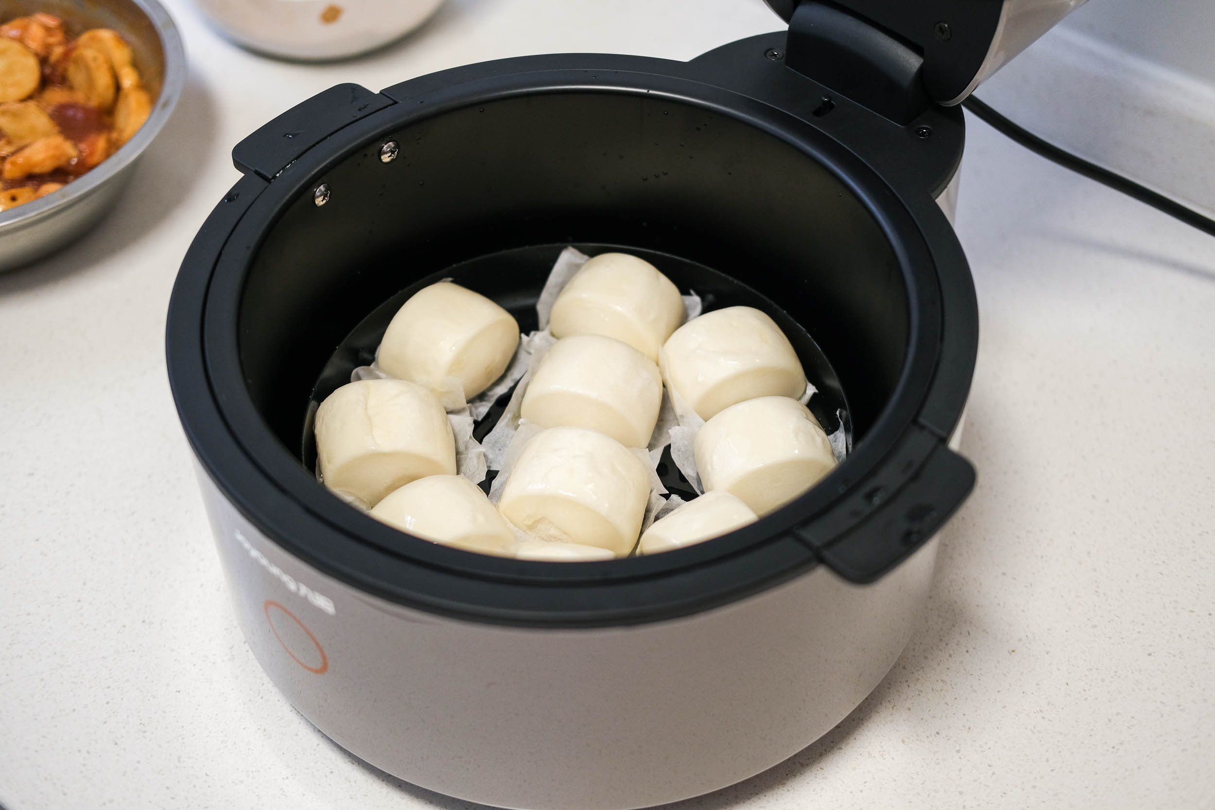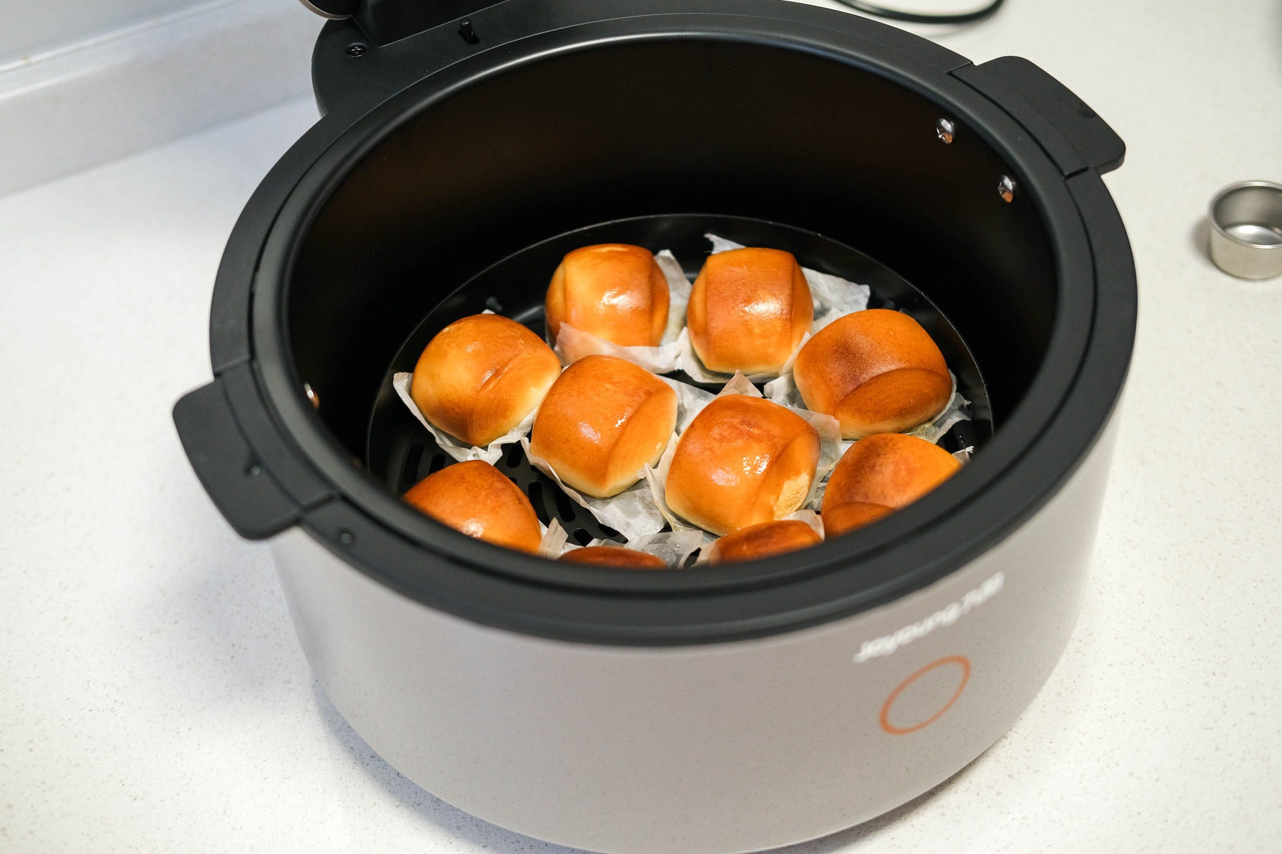 由于我也是第一次用空气炸锅产品,所以先尝试做个简单的黄金馒头。5.5L的大容积确实非常不错,能够放下10个小馒头,一家三口完全足够了。刷层油,关锅,设置温度180℃,时间5分钟,启动。