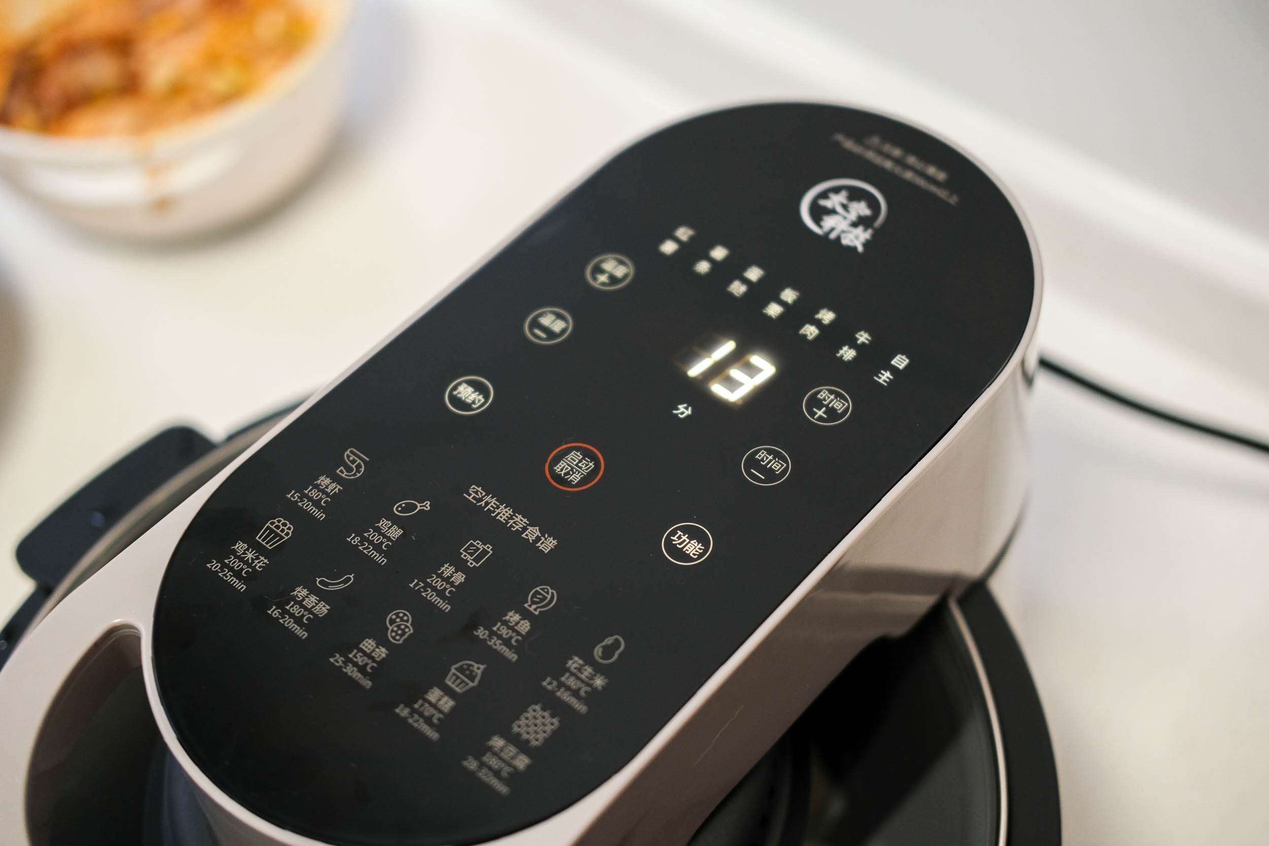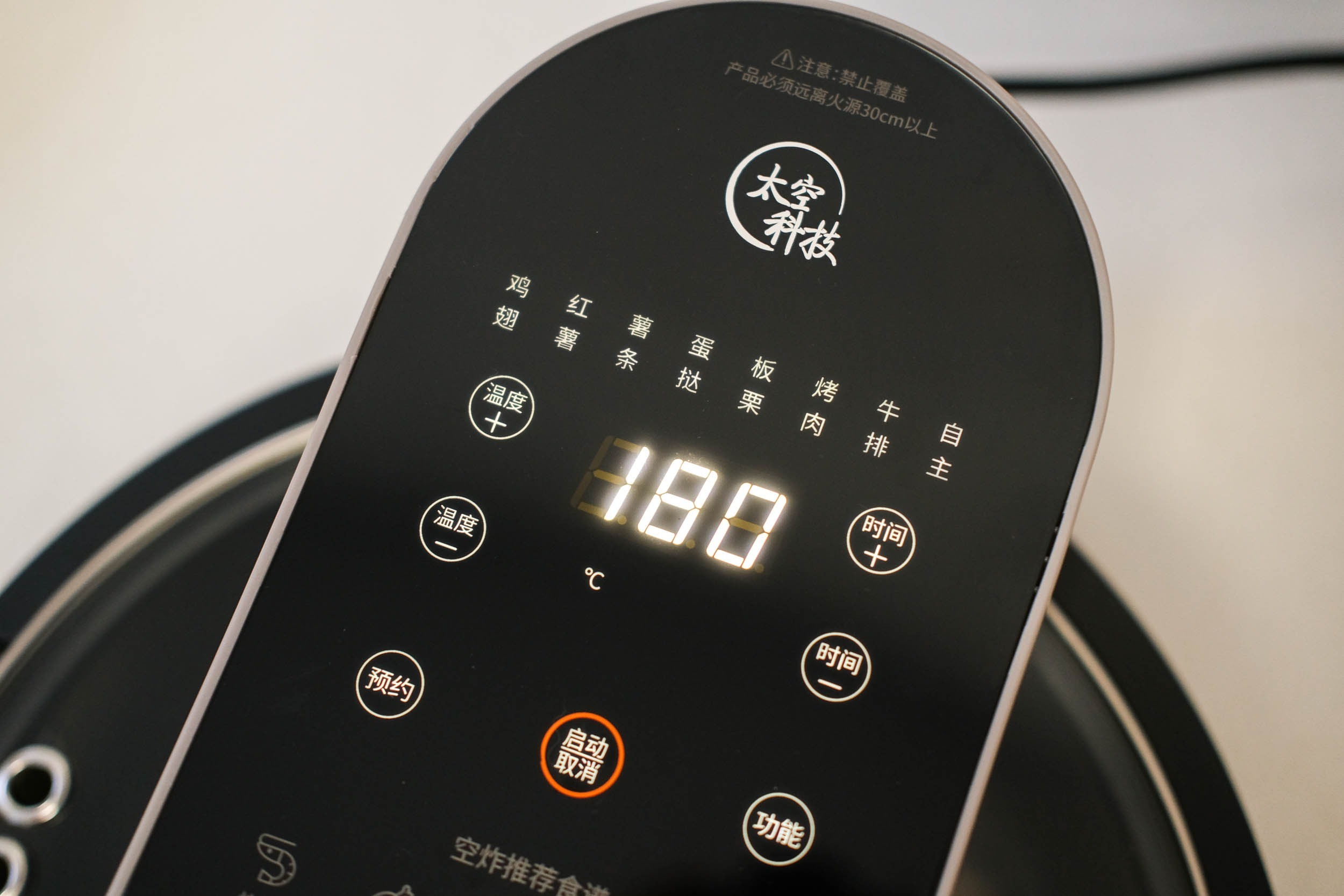 机器顶置了电子触控屏,各项功能按键标记得还是比较清楚的,使用起来也没什么学习成本。我没有看说明书,感觉就能轻松地把控。机器本身内置了鸡翅、红薯、薯条等7种食材模式,如果是做着几样食材,一键启动即可。当然我们也可以自主地设置温度和时间,也支持预约开启。