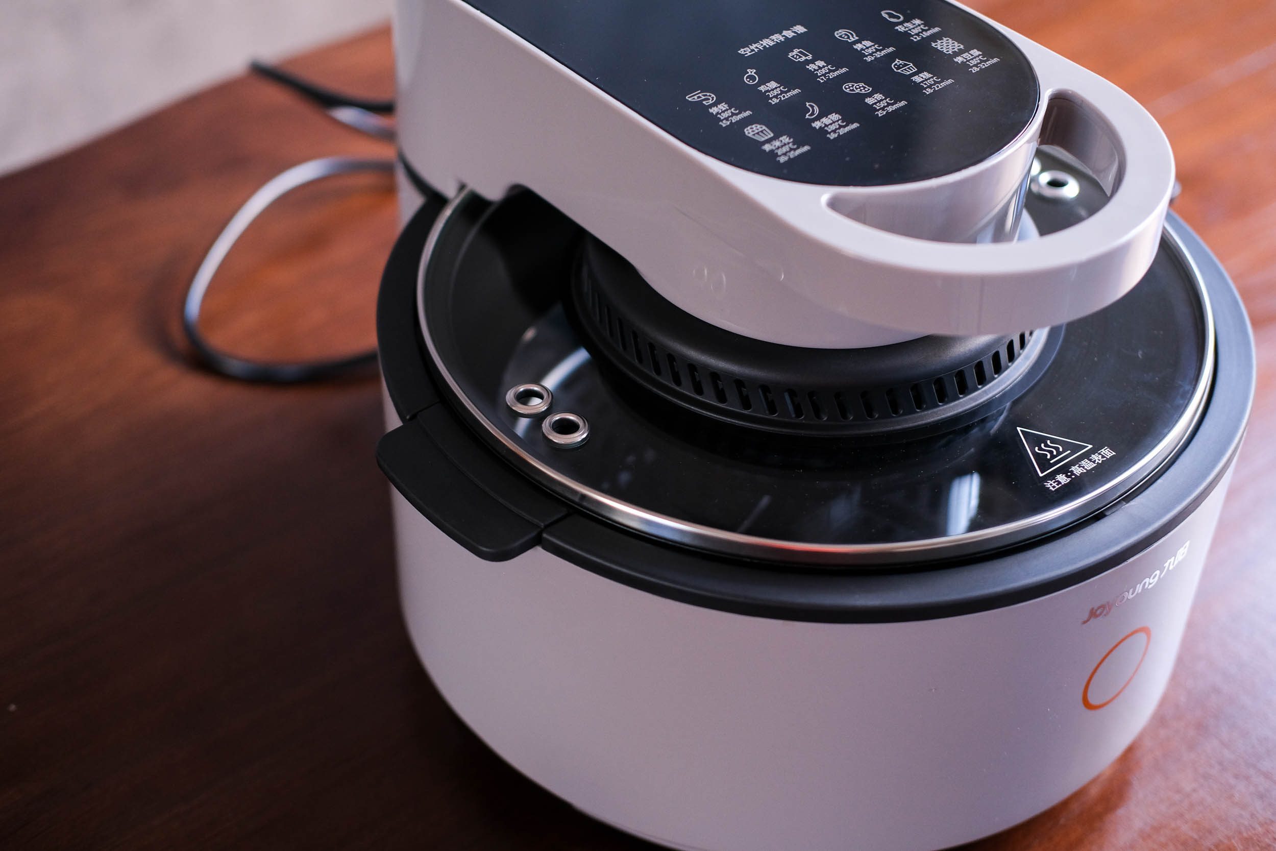 和传统抽屉式不同,九阳太空空炸VF736采用翻盖式,有点像是电饭煲,无需弯腰操作。锅盖上集成了立体热风循环加热系统,包含了碳素纤维加热管,以及9叶螺旋扇叶。再加上1200W的大功率,这套系统保障了食材不用翻面也能上色均匀,烘出食材油脂,口感酥脆轻盈。