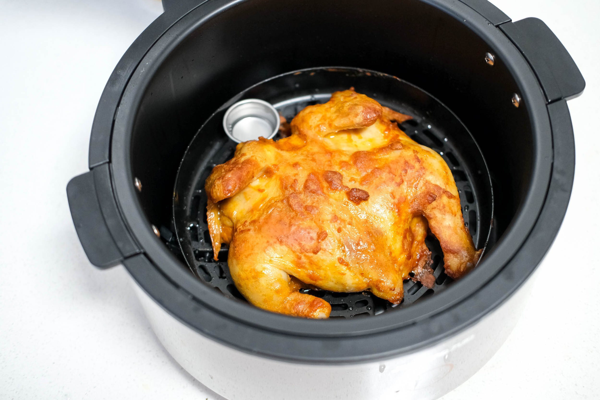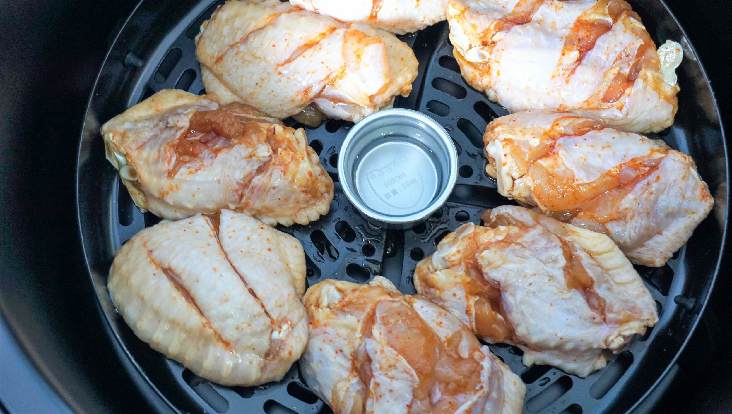 鸡翅没啥难度,其实我想吃的是炸全鸡。得益于5.5L的容积,把一整只鸡放入锅中,还是比较轻松的。当然,鸡放进去之前还是需要腌制一下的,我用了奥尔良调料。设置温度180℃,30分钟。