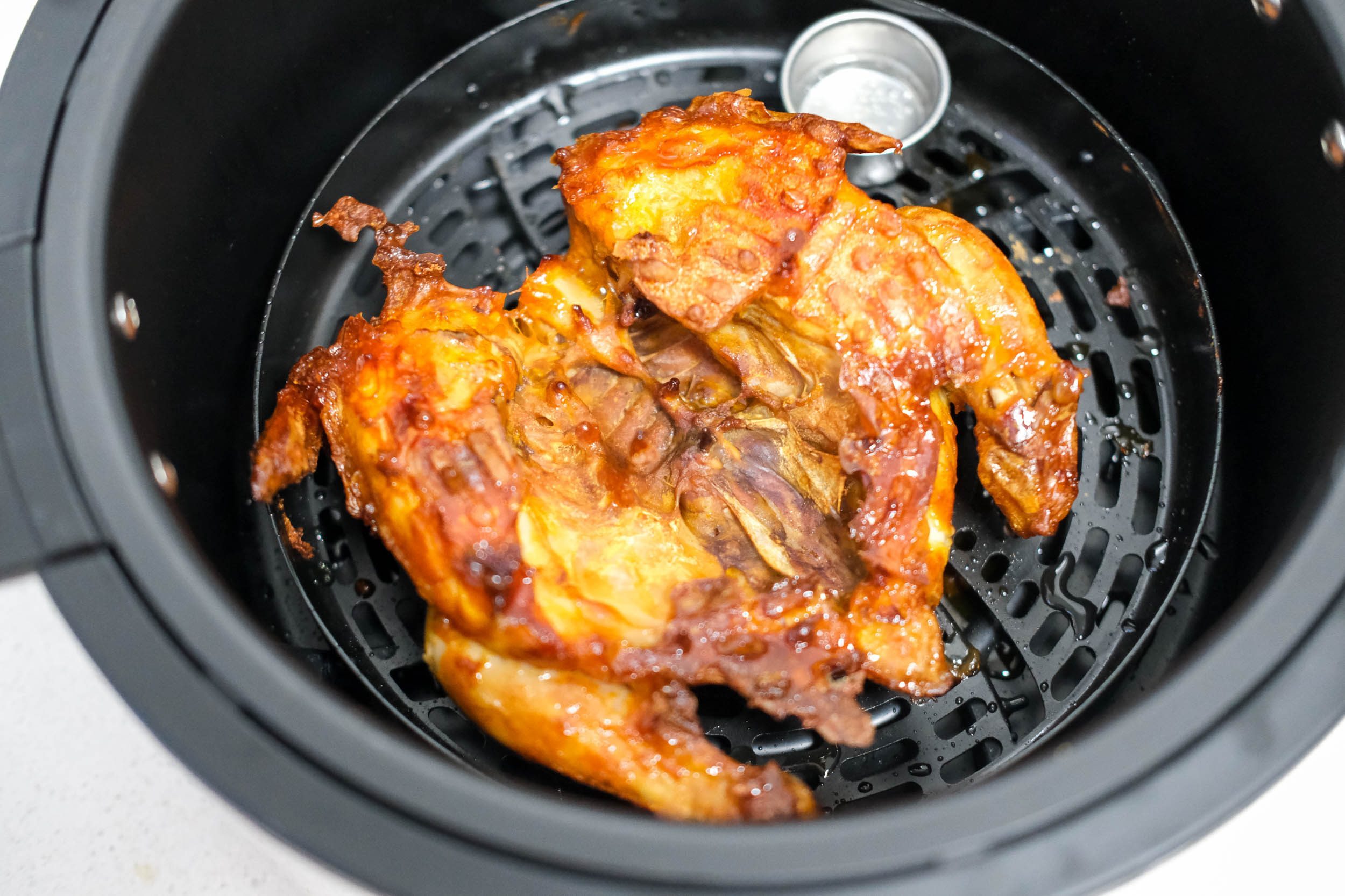鸡皮被烤得非常的香脆,然后,重点是内部的鸡肉,还是非常的鲜嫩的,而且汁水也保留,吃起来一点都不柴。第一次用空气炸锅烤全鸡,没想到会这么的成功。女儿的评价,“和肯德基一样好吃。”