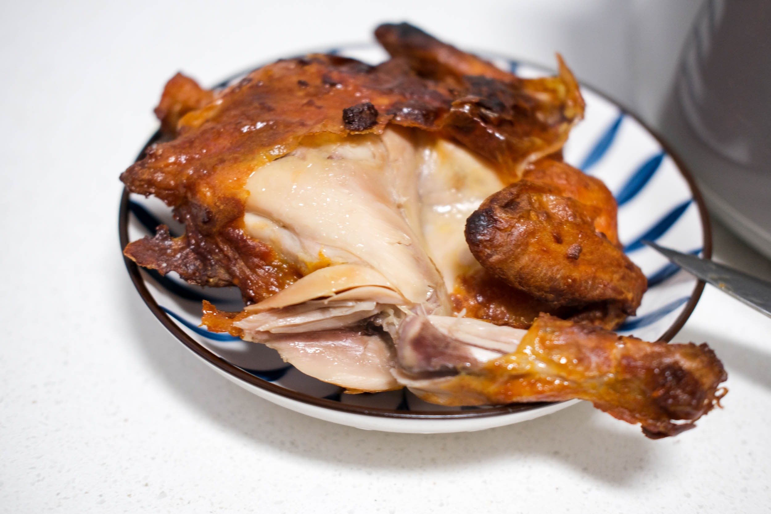 出锅之后,上表面金黄金黄的,而且鸡皮非常的脆。由于烹饪的过程中,我没有给这只鸡翻面,对于下一面是咋样我也没底。