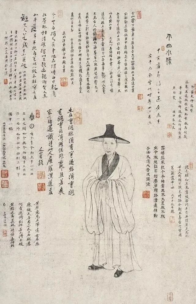 过去那个拥有显赫身份的朱耷,如今已是一个头戴斗笠、身材消瘦、内心平静、闲居世外的高僧。他将这幅小像带在身边,请友人们题写了很多文字,自己也陆续在上面题字。之后,文字狱的出现,他不敢轻易将《个山小像》拿出,只是将其卷好,带在身边。