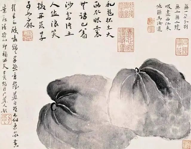 又是一个夏天,小和尚给传綮和尚送来了两个大西瓜。这让他想起了“不食清粟”,想起了家族香火的延续,于是提笔画了两个大西瓜,同时题写了“从来瓜瓞永绵绵,果熟香飘道自然。不似东家黄叶落,谩将心印补西天。”他下决心要遁入空门。