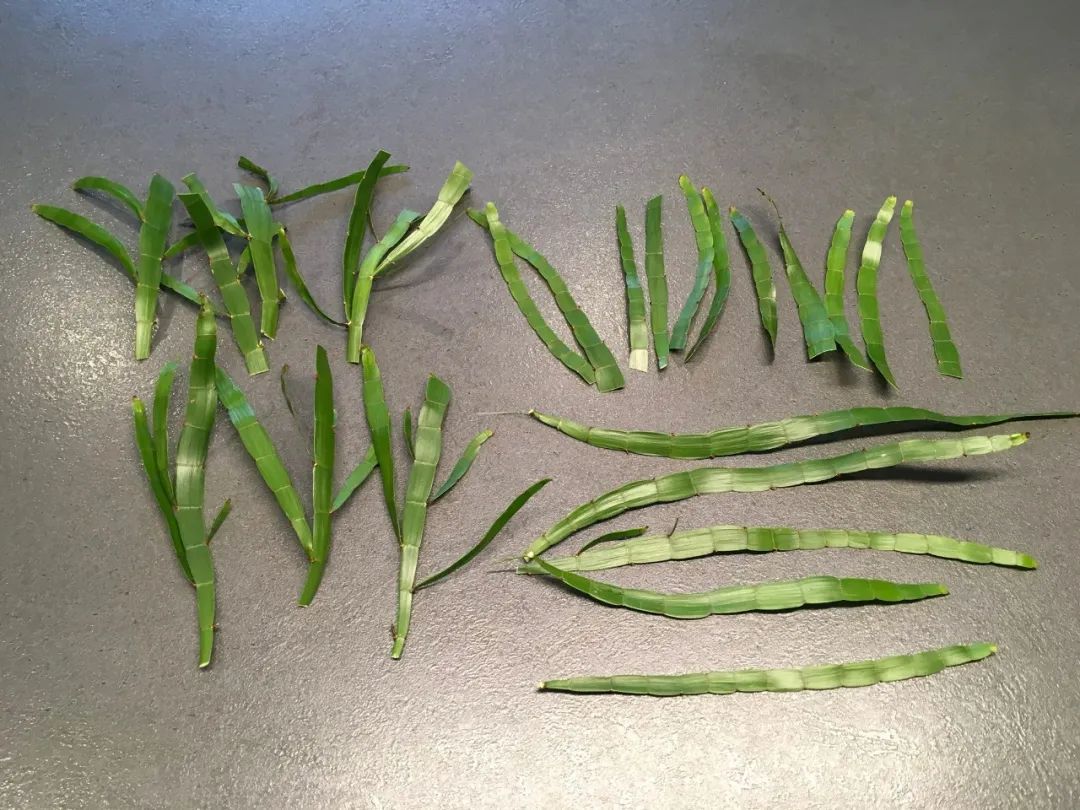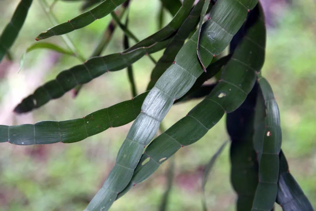 有一些茎上是不会长叶子的,有一些则会长叶子,这也是它另外一个奇特的地方。有一些长叶子的茎,随着时间推移,叶片也会逐渐消失,这种植物并不是依靠它的叶片进行光合作用的,它那绿色的变态茎可以进行光合作用。