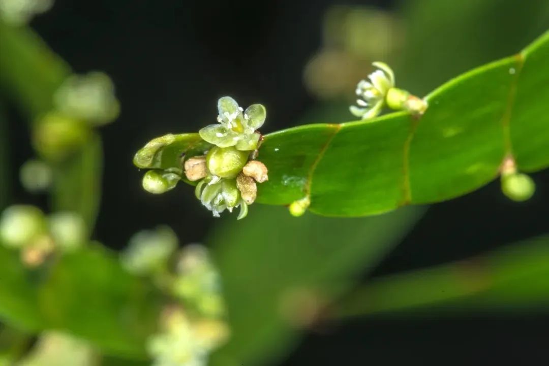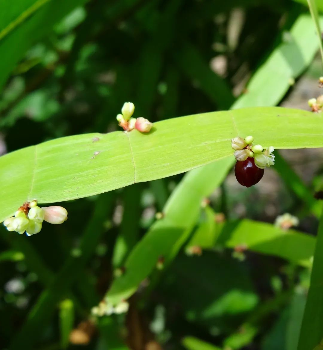 如果能将竹节蓼养在光线比较好的环境下,每天有较多光照,加上环境温润,它可以在每年春季开出白绿色的小花,它的花朵就长在叶状茎上,就是在两个节点相交的地方。它还可以孕育出可食用红色的小浆果,成熟后会变成黑色。