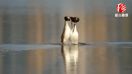 头顶凤冠,脚踏水面,嘴衔水草,直立水中,这两只姿态优美的水鸟叫作凤头鸊鷉,这种在水中的互动是它们表达爱意的一种方式,也被爱鸟人称为“撞胸”。