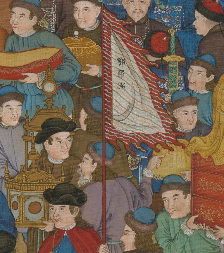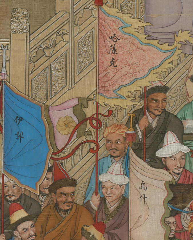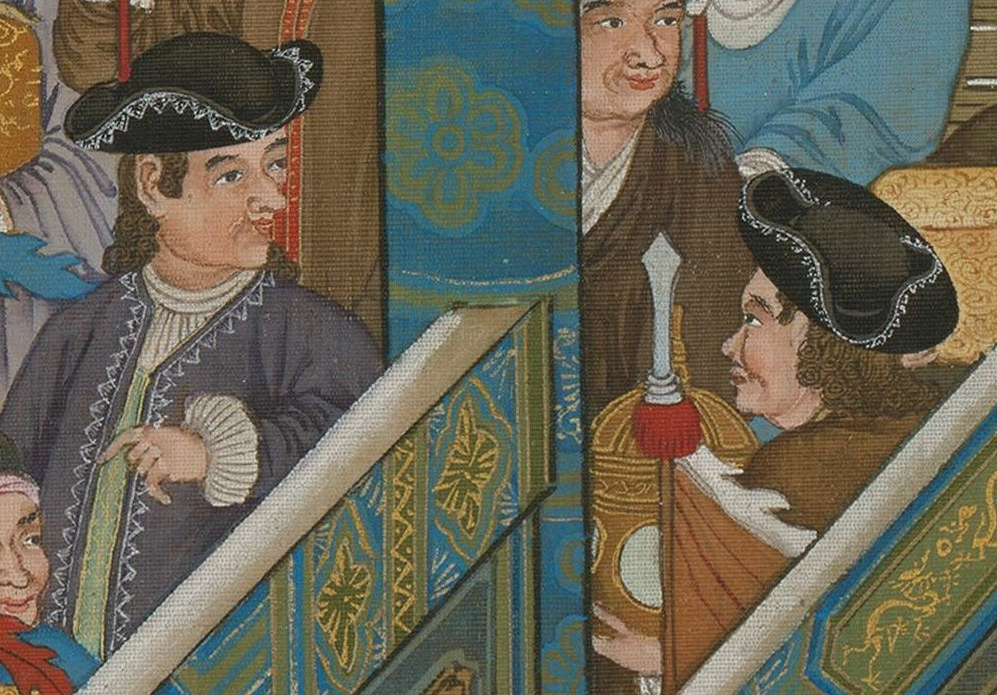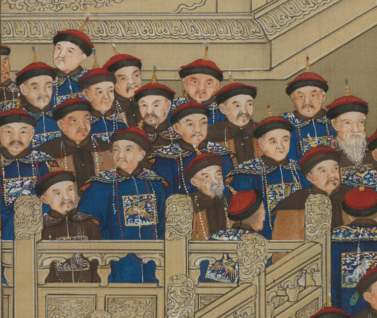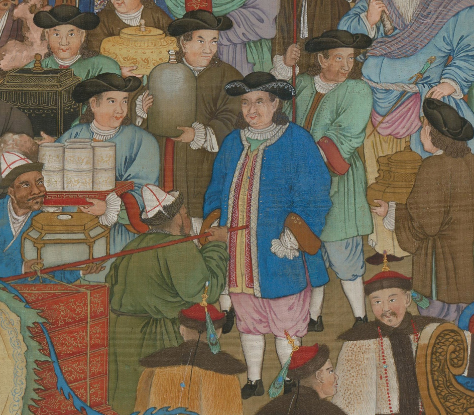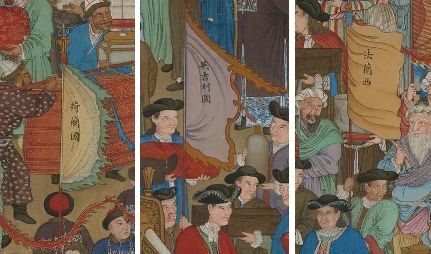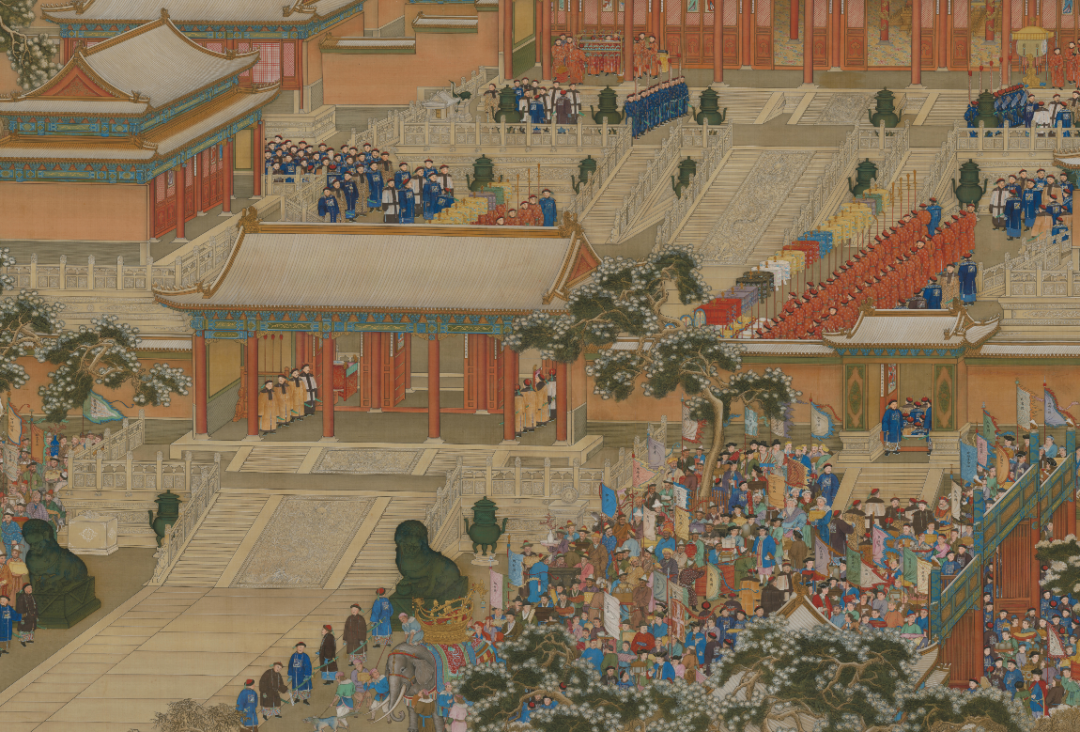 画面中宾客云集、人头攒动的大场景都是清宫里的画家们想象出来的。这是大清,一场有关“天朝上国”的美梦。