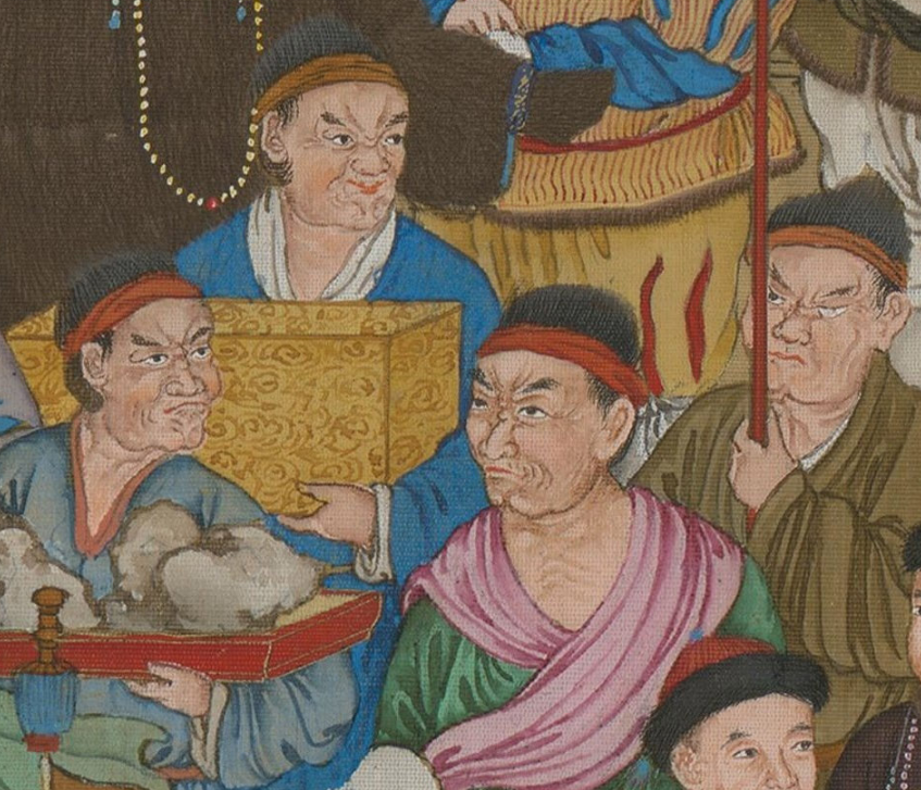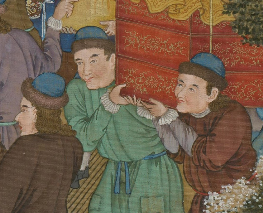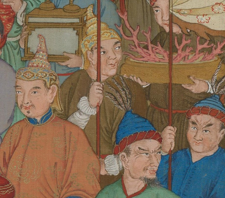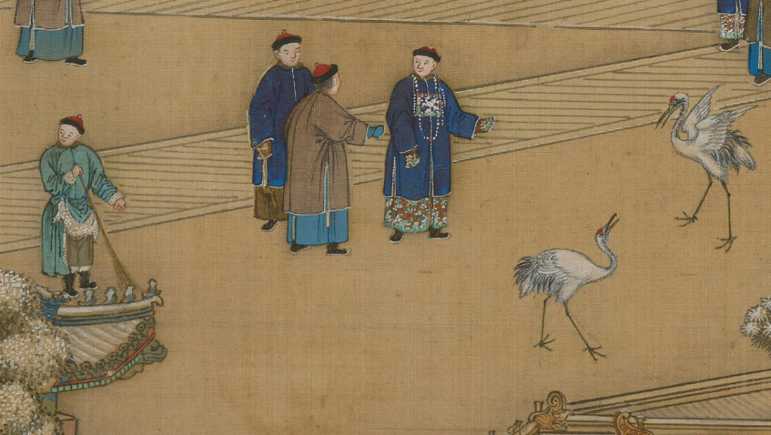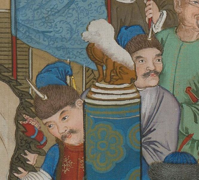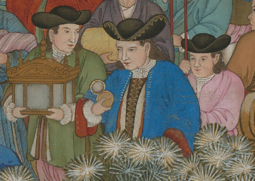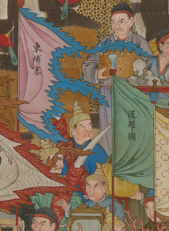 画面中宾客云集、人头攒动的大场景都是清宫里的画家们想象出来的。这是大清,一场有关“天朝上国”的美梦。