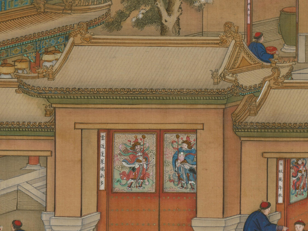 因为正在过春节(古代称“元旦”),门上都贴着成对的门神画。