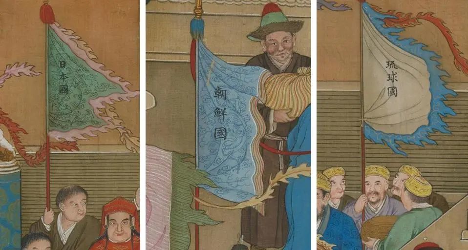 太和门外,各种举着旗子的小方阵正在等待入场。首先,是我国东面的日本、朝鲜、琉球。