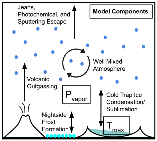 科学家通过夜面凝结模型研究结果表明,受太阳辐射和太阳风的影响,月球上大约 15% 的大气总水蒸气质量会在月球夜面凝结成冰,经过推测,整个月球大约会含有18 万亿磅火山水,大部分水冰今天应该仍然存在,并保存在月球两极的区域,而且月球的南极积累的冰比北极多。这是因为月球南部的冷阱总面积更大,同时,月球南极冰层沉积物也往往比月球北极沉积物厚冰层更厚,因此,在月球的南极地区最冷的冷阱附近也是水存在的最佳位置。