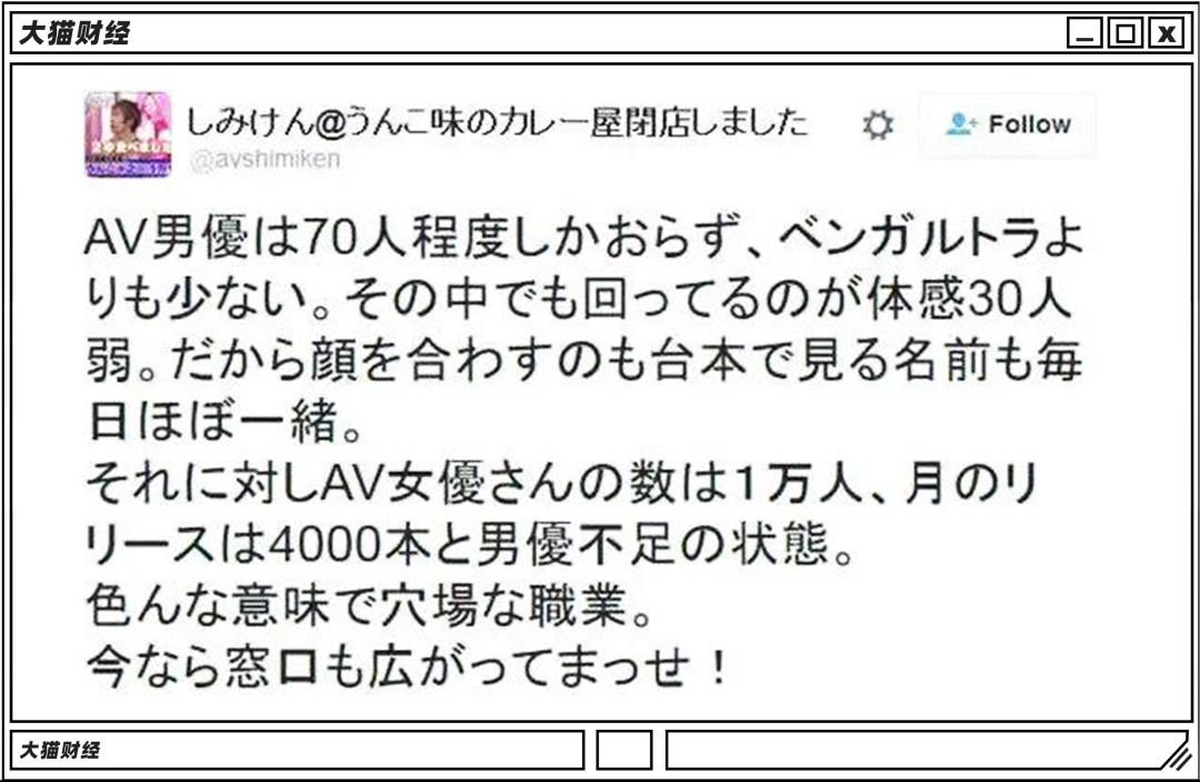 2018年日本一项民间调查显示,有注册记录的AV男优数量甚至还不到200人。