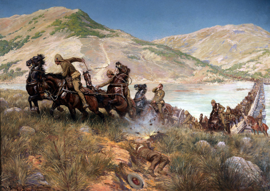 布尔战争时期的绘画作品(General Sir Redvers Buller's troops crossing the Tugela to relieve Ladysmith, February 1900),图源:英国陆军博物馆