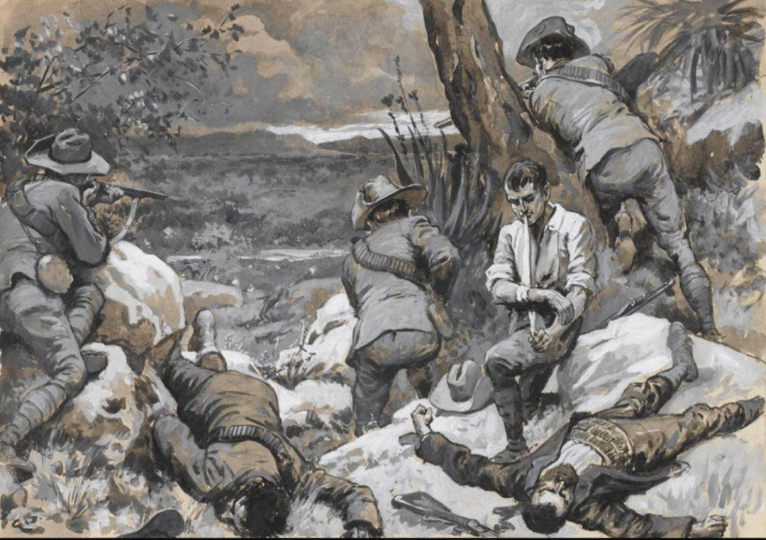 布尔战争时期的绘画作品(The Boer Attack on Caesar's Camp: A Hot Corner with the Border Mounted Rifles, 1900),图源:英国陆军博物馆