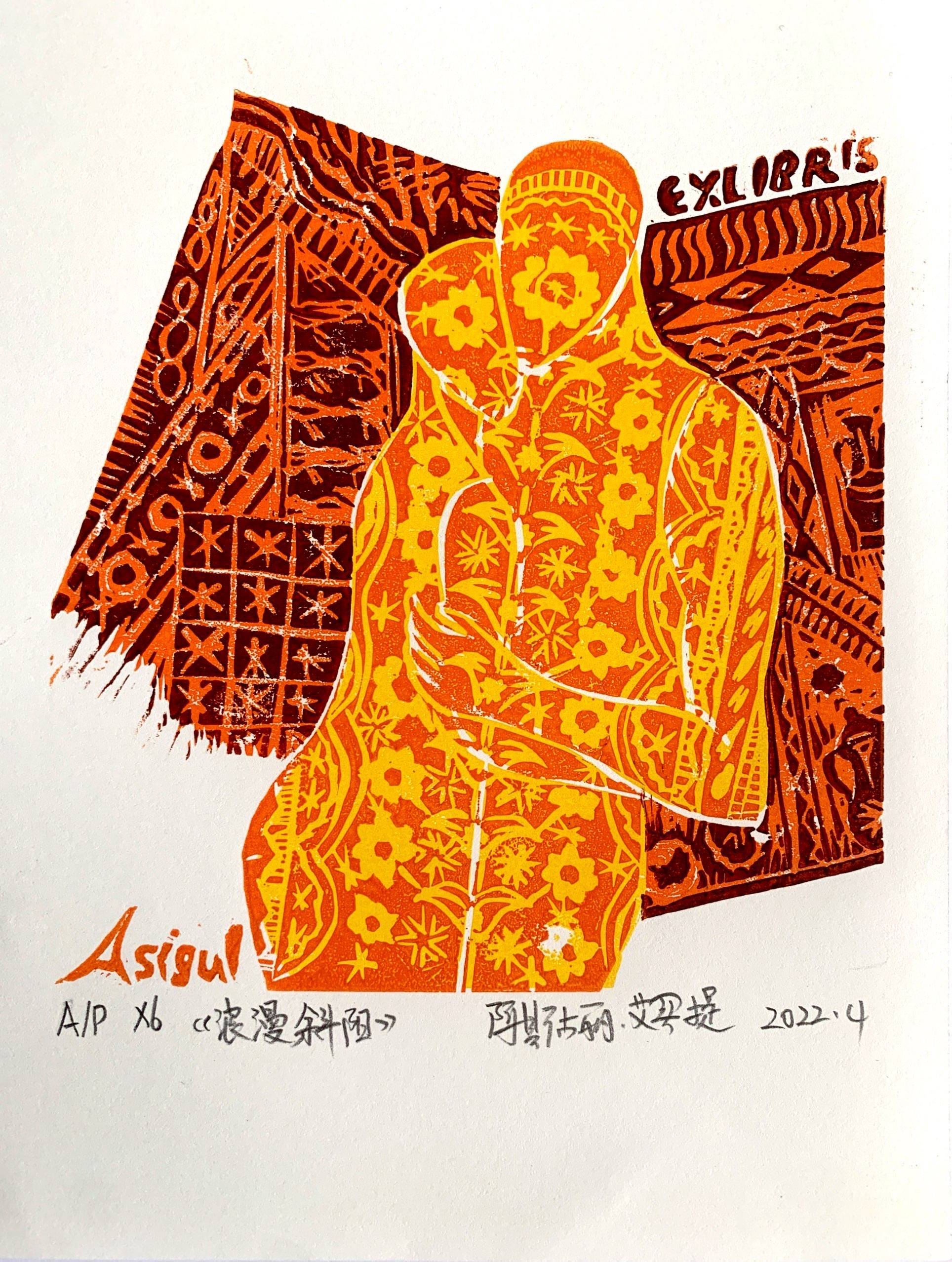 阿斯古丽·艾买提、浪漫斜阳、13_14cm藏书票、2022年