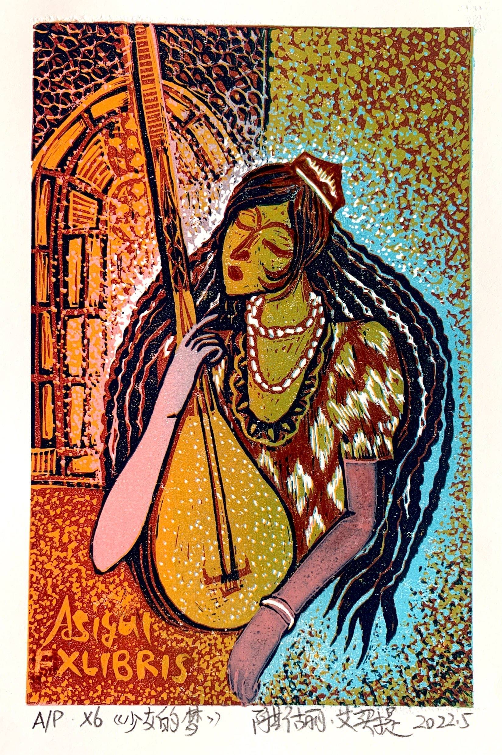 阿斯古丽·艾买提、少女的梦、9.5_15cm、藏书票、2022年