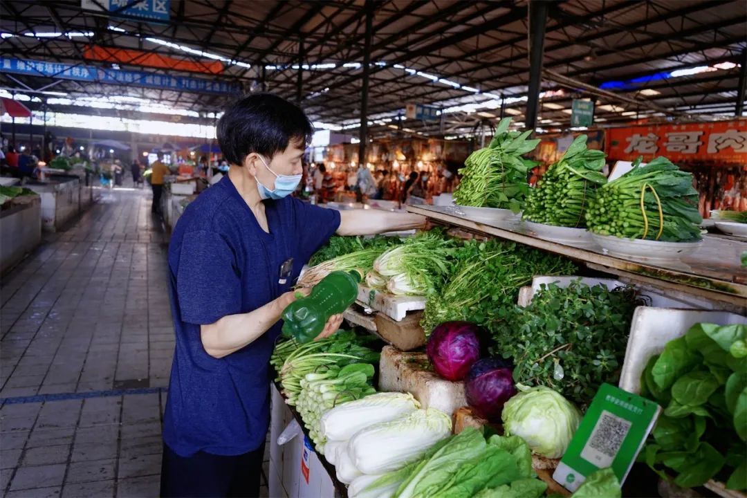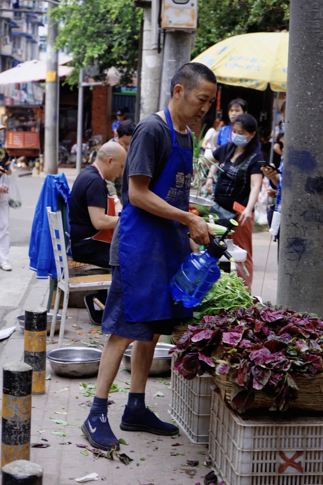 得闲,蒋大哥又往码得齐整的菜堆上喷洒清水,以始终维持菜叶的水灵,极佳的卖相。