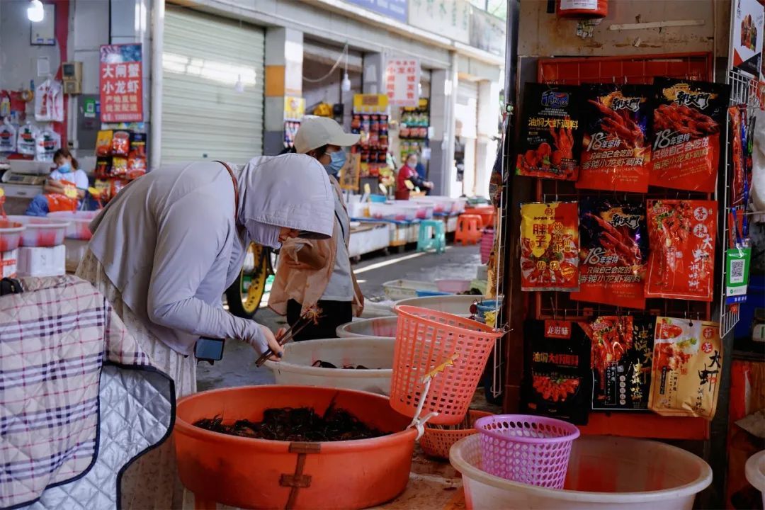 年轻人则更多聚集在水产区域,俯身弯腰,手持筷子,将小龙虾一个一个选进便于装盛的垃圾桶,以此表达对菜市场时节的感知。