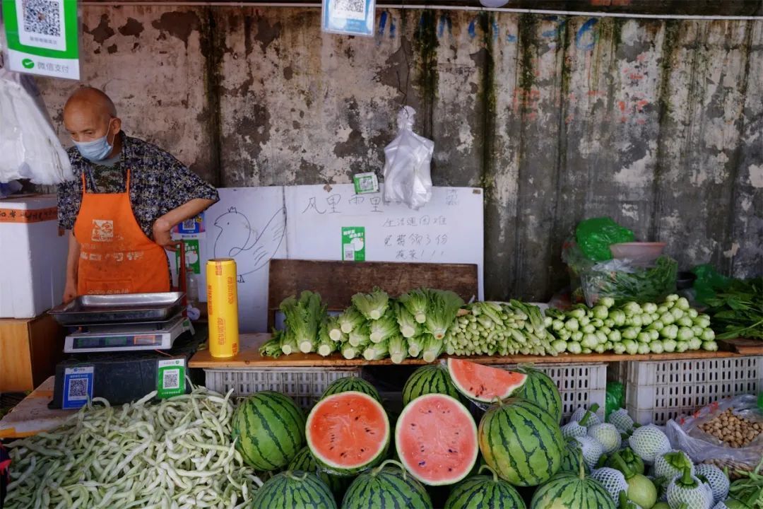 各区域有专门的职能,基本的菜市分类法则下,蔬菜摊也顺带售卖应季的西瓜和杏子。瓜果菜蔬热烈上市,夏天菜市场的品种的丰富程度,仅次于秋季。