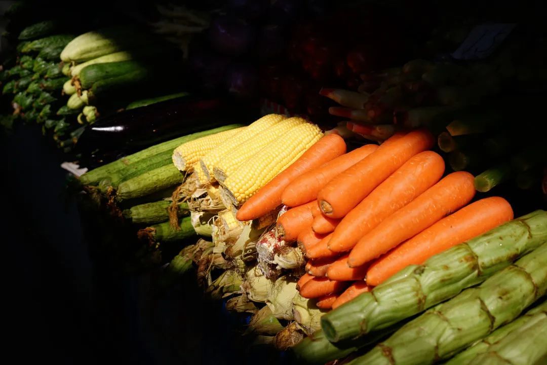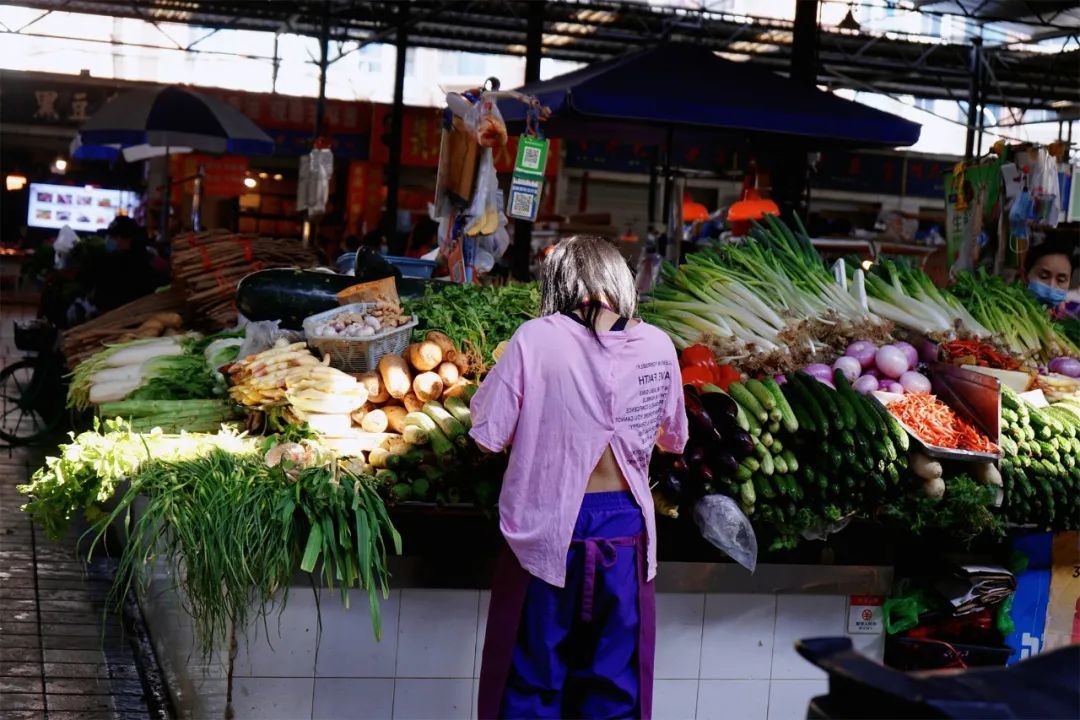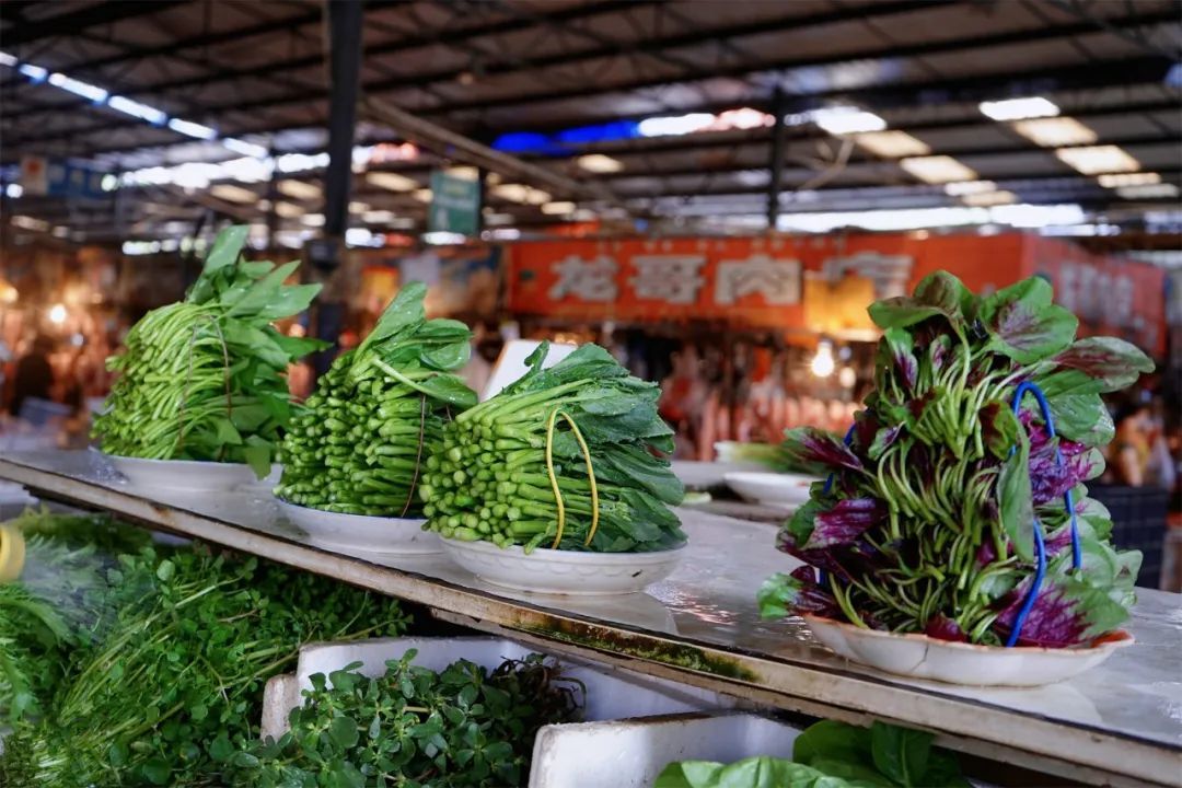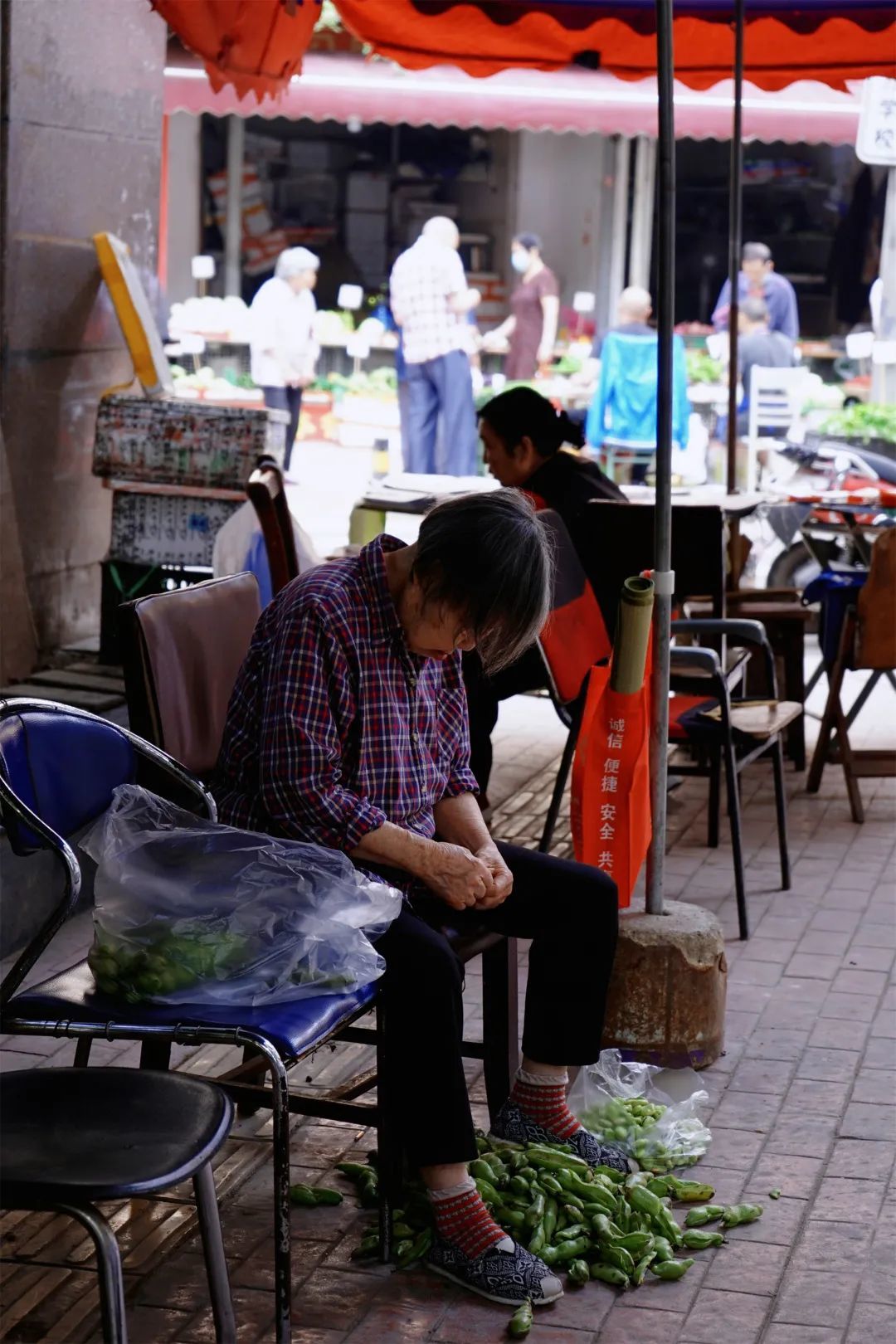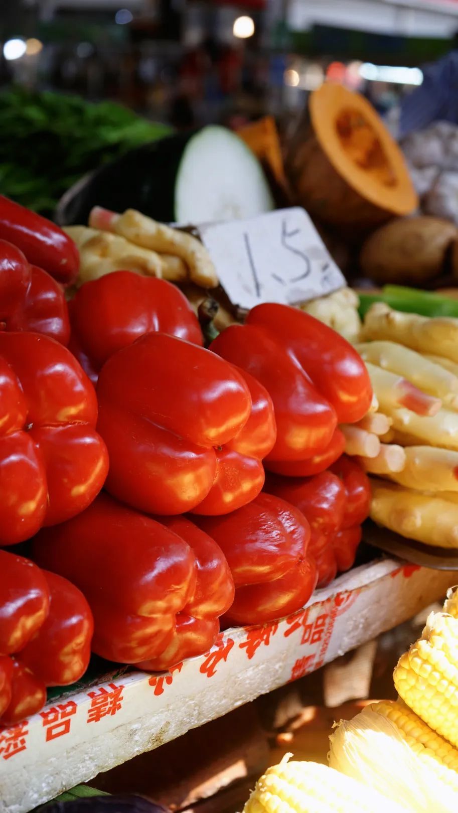 蔬菜整齐码放,组成明亮色块,绯红的萝卜、橙黄的彩椒,乳白的高笋,红紫的苋菜,碧绿的黄瓜……让人不得不怀疑,每个摊主都是色域绘画领域的大师。