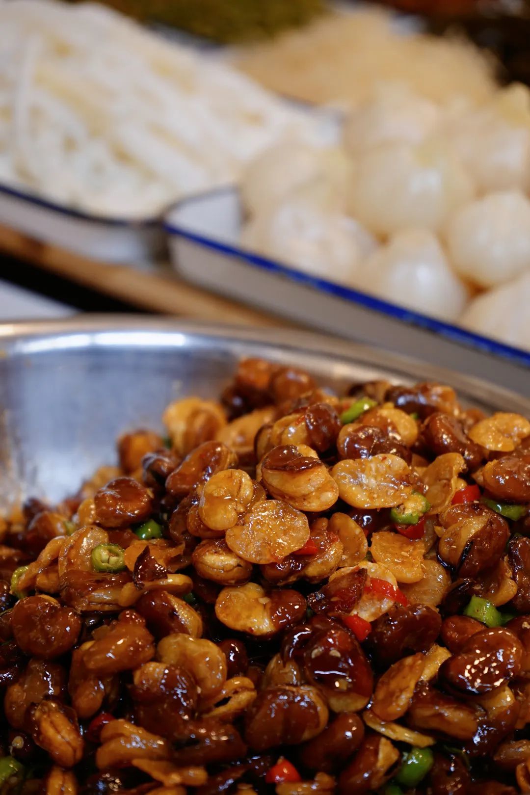胡豆是渍胡豆的做法,又有点像怪味胡豆。干胡豆泡发后,又过油,形成酥脆的口感,下稀饭最合适。