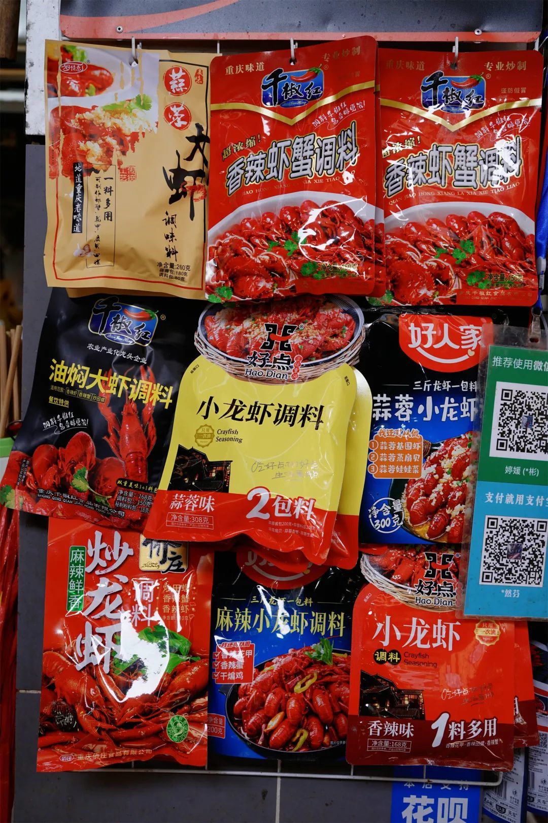摊位的墙上,10余种小龙虾调料,比泡菜鱼水煮鱼调料还多。总有一包,令小龙虾们愉快入味。鱼头再肥硕,也只有缓慢地等待被谁带走。