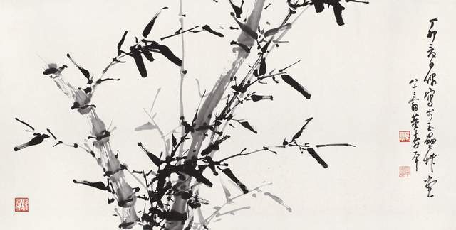 所绘竹干,古朴浑厚,道劲挺拔,气宇轩昂,如大丈夫迎风屹立;所画竹叶,出入传统,一笔写意,展现转折、卷曲、摇动之姿。