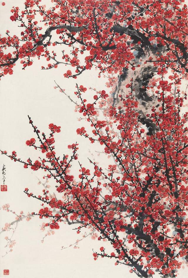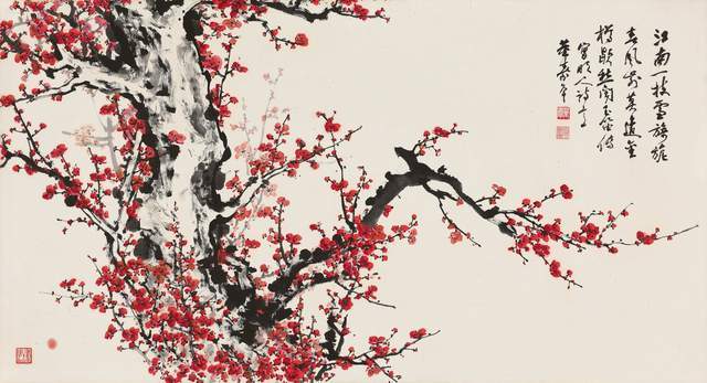 董寿画所写朱砂红梅、疏密有致,浓淡相宜 , 简繁得体,赏心悦目、其最大特点是长于取势,巧妙经营,将梅花傲雪斗霜的无畏精神,蕴含于花枝摇曳的动势之中。