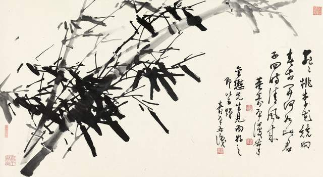 董寿平写竹,取法元人,尤得吴镇的笔墨精髓。虽受“元竹”影响,但融汇了明清诸家之长,又将自己的书法功力和体式贯通其中,用笔老辣厚重,用墨枯润相映,纵横潇洒,颇得生动灵变、劲中含翠之致。
