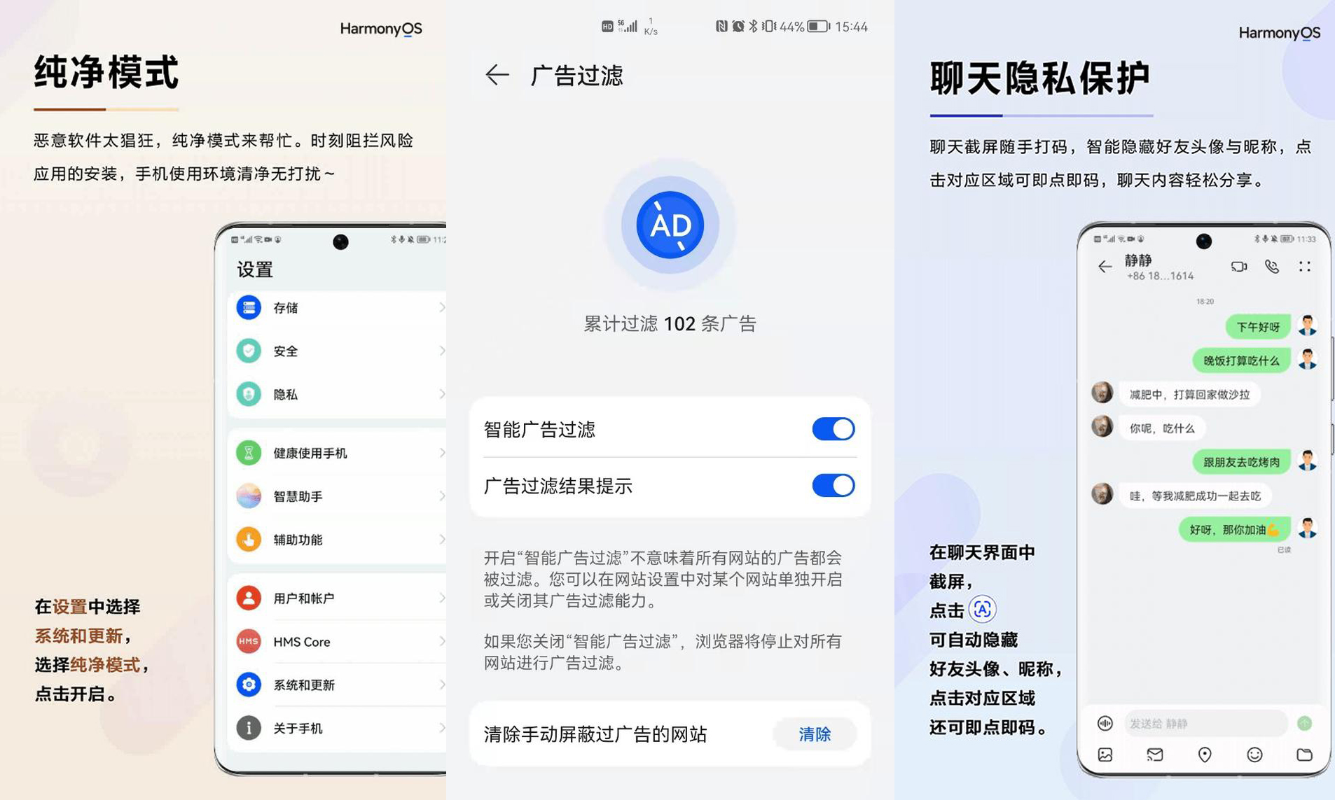 而比起苹果iOS来说,国内手机厂商在系统安全方面也是不遗余力,而且相对更适合国人的使用习惯。就拿鸿2.0系统来说,其内置的“纯净模式”可以有效阻挡和拦截风险应用的安装,这对于一些中老年人来说非常受用;而自带的广告过滤功能则可以有效过滤一些烦人的广告和弹窗,还有聊天截图也可以通过聊天保护功能来快捷打码,操作方式也十分便捷。