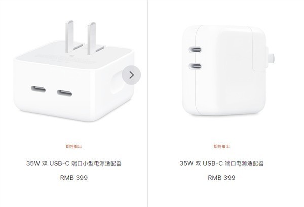今日消息,苹果在官网上架了两款此前传闻的35W双USB-C口充电器。官方称其中一款35W双USB-C端口小型电源适配器能让你轻松地同时为两部设备充电,小巧玲珑,插头还可折叠,方便携带和收纳。