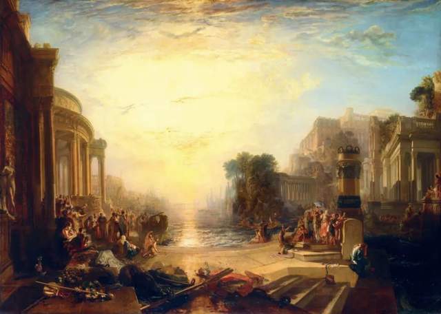 另外,从透纳之后的作品的角度来看,这幅油画中月亮位于前景,这一点也同样十分重要。我们经常可以看到透纳将太阳或月亮作为画面中的光源(比如下图《迦太基帝国的衰落》),这是他在第一幅油画作品中就已经形成的思维习惯,而在当时他就已经可以将其描绘得恰如其分。