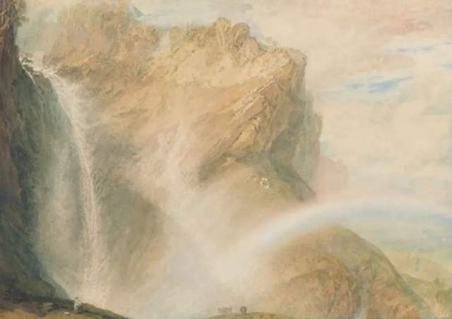 《莱辛巴赫瀑布上方:彩虹》,1810年,水彩、石墨画,用白色提亮并刮除。
