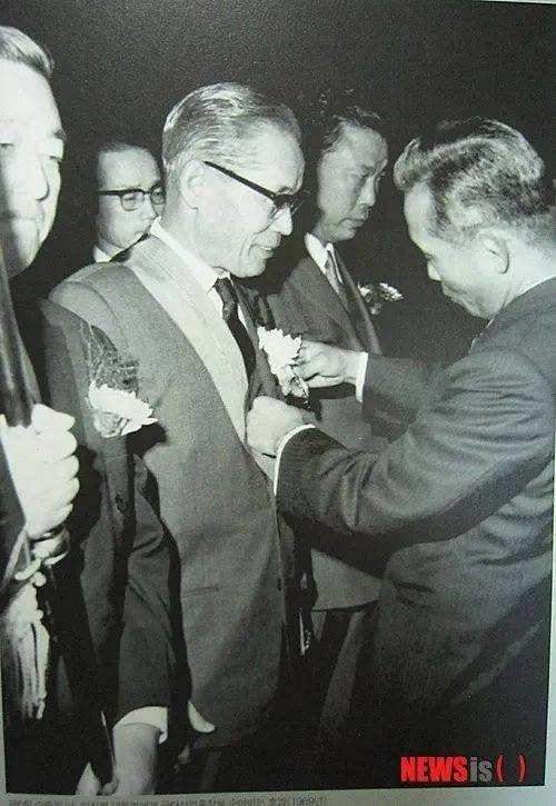 图为总统朴正熙给李秉喆戴花