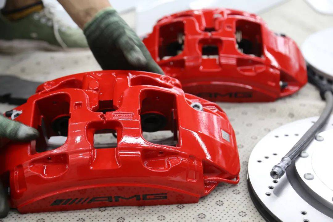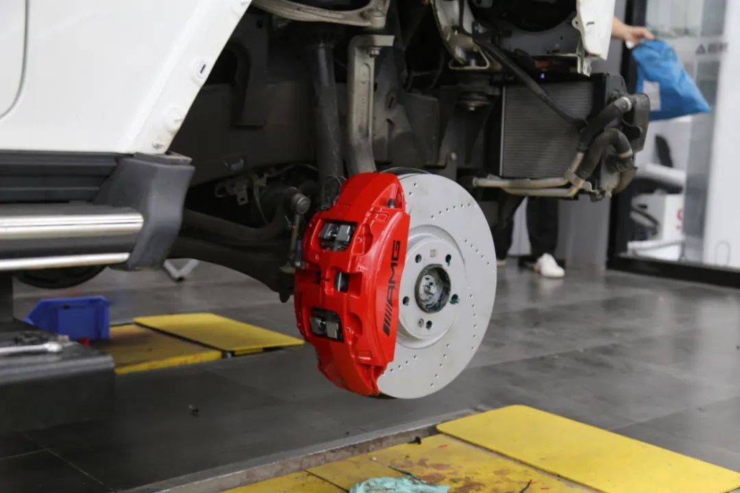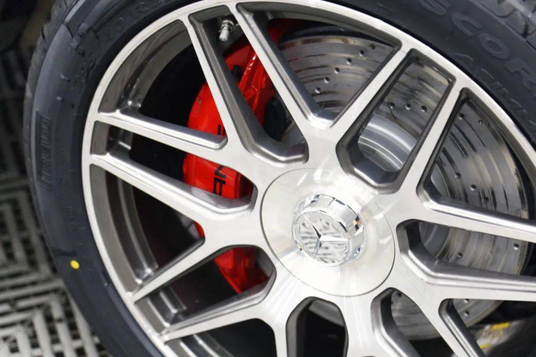 车主选的是AMG的前6活塞的卡钳,后边的卡钳没升级,只是喷了个颜色换了个加大盘。