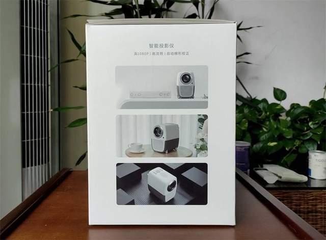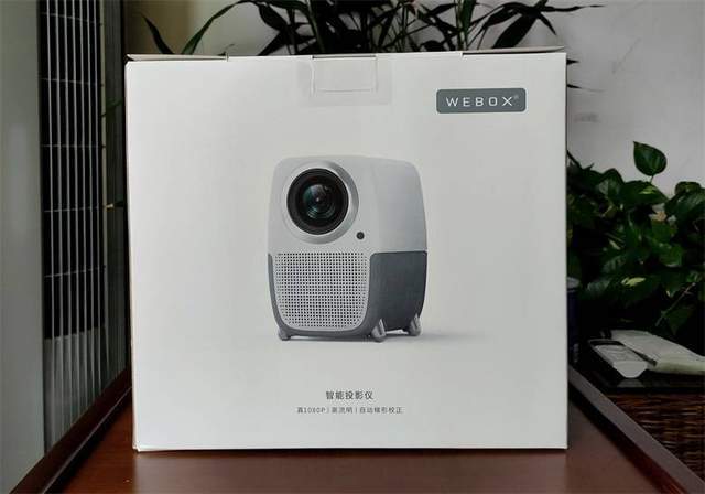 泰捷WEBOX T1S投影仪纯白的外包装显得非常素雅,正面可见投影仪的渲染图,下方为智能投影仪及真1080P\高流明\自动梯形校正。外包装的侧面可以看到该款投影仪和家居的结合非常融入,典雅的配色一点也不会显得突兀。