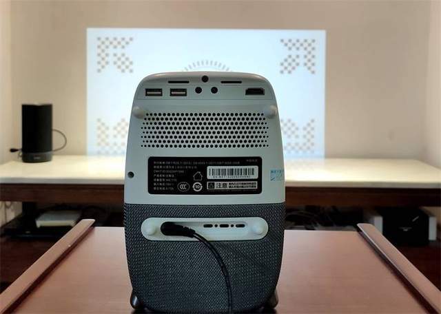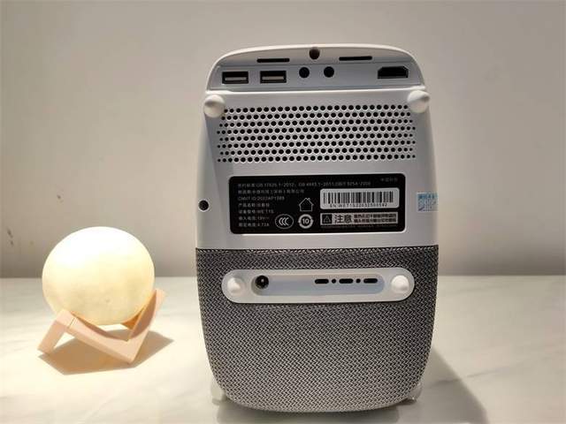 从背面看,泰捷WEBOX T1S投影仪的接口非常丰富,上方从左至右分别有两个USB 2.0接口,一个3.5mm耳机接口,一个AV输入接口及一个HDMI 2.1高清线接口,众多接口更丰富了投影仪的可玩性,可接入电脑、游戏手柄、机顶盒等设备,无论怎么玩都可以。