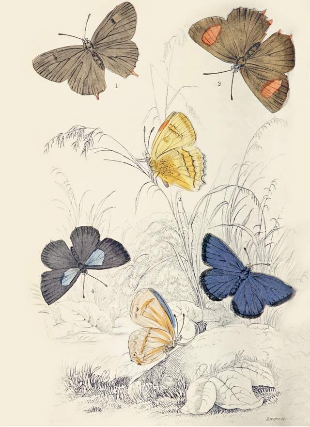 詹姆斯·邓肯《英国蝴蝶》,1840年,紫斑小灰蝶(最后一行,右)的表面呈淡黑紫