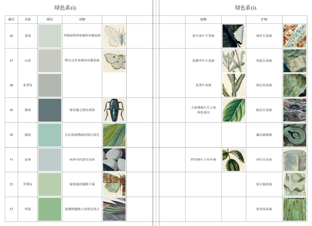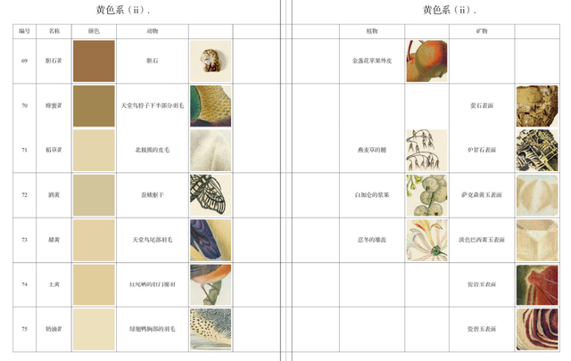 18世纪末-19世纪初,为了能将各种生物物种信息分门别类,建立通用的标准色彩体系对自然学家来说至关重要,艺术家也需要一套标准色彩以便准确地描绘动物、植物和矿物。继维尔纳之后,矿物学家和博物学家们也纷纷创建起自己的标准色彩表。