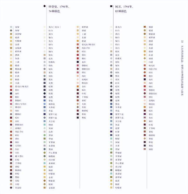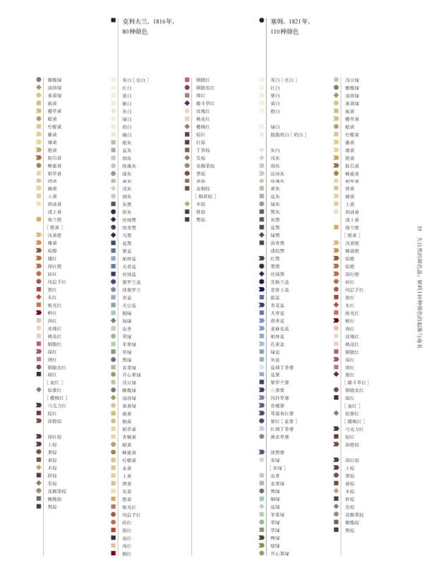 1814年,“维尔纳色彩命名法”正式出版,它也成了达尔文搭乘“小猎犬号”开启探索之旅前的必读书。随着这套命名法被越来越多的动物学家、植物学家、矿物学家等科学家所接受与完善,颜色也从起初的79种增补至110种,而后成为了19世纪广泛应用的色彩分类法和命名法。