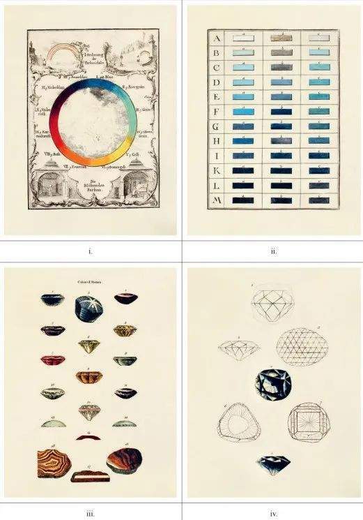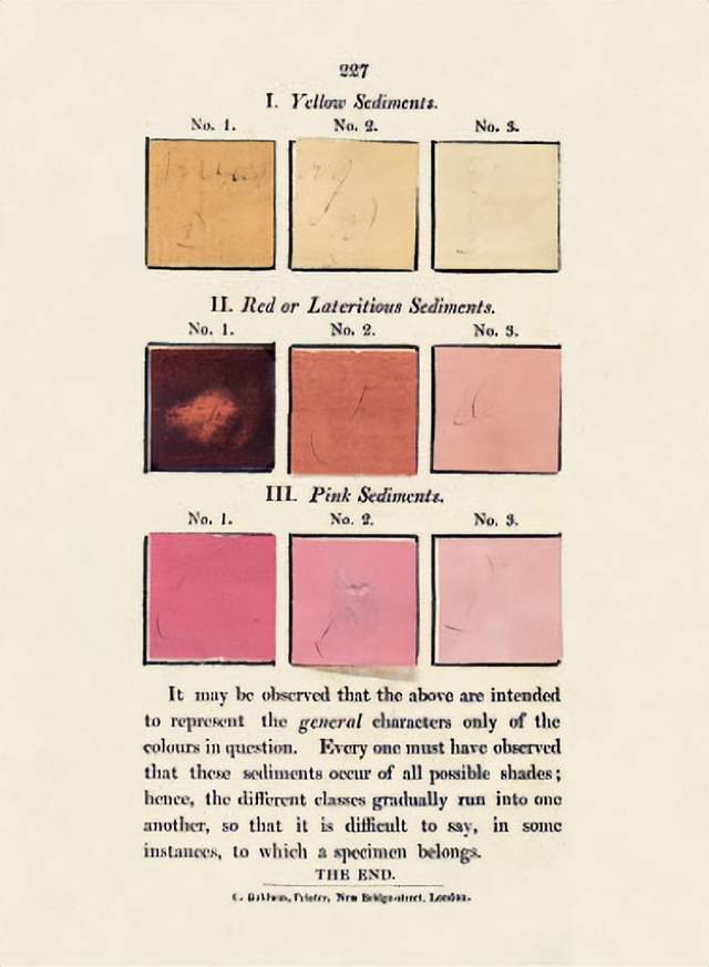 1774年,为了更好地识别和描述矿物,德国地质学家亚伯拉罕·戈特洛布·维尔纳(1749-1817)根据矿物的外物特征,设计出一套分类系统。1814年,苏格兰艺术家帕特里克·塞姆(1774-1845)在维尔纳提供的矿石样例的基础上,补充了动物和植物样例,还给每种标准颜色增加了展示色卡。