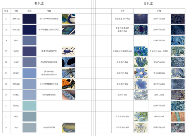 比如蓝色系,作者就在书中列举了苏格兰蓝、普鲁士蓝、靛蓝、青花蓝等11种蓝色。