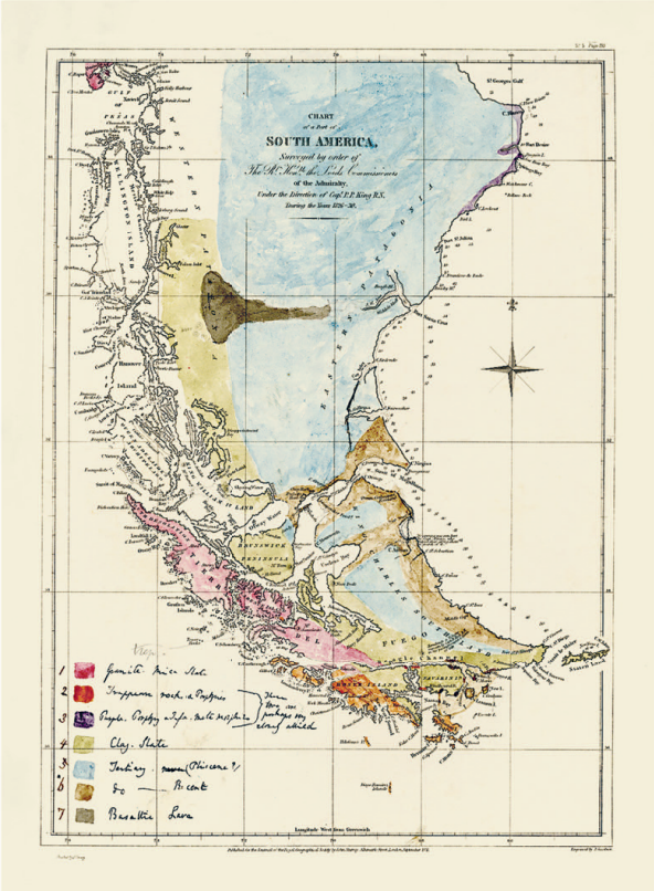 1831-1836年,查尔斯·达尔文在乘坐“小猎犬号”的途中手工绘制了南美洲南端及其海岸附近岛屿的地质地图