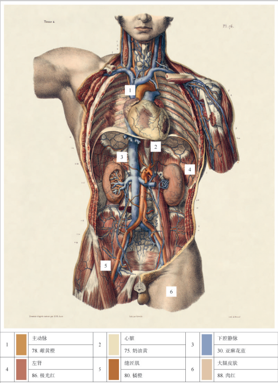 马克·琼·布尔热里,《人体解剖图谱》(1831-1854年),解剖图显示的是胸腔和腹部的血管和器官。