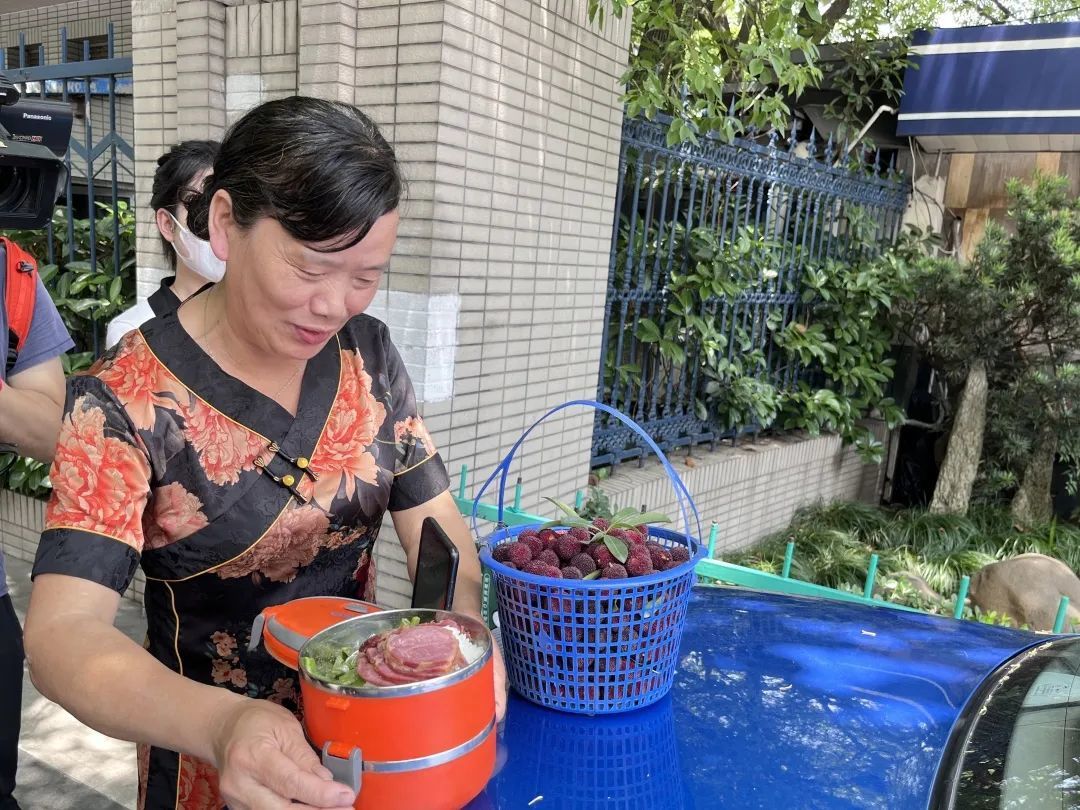 杭州市学军中学,考生家长带来了爱心餐,还有新鲜采摘下来祛暑的杨梅,寓意“扬眉吐气”。