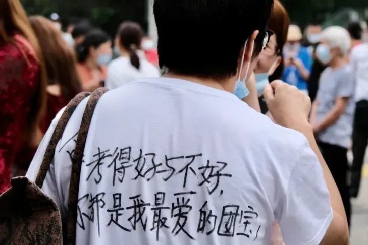 宁波江北一考点外,在衣服上写下祝福与爱意的考生家长。