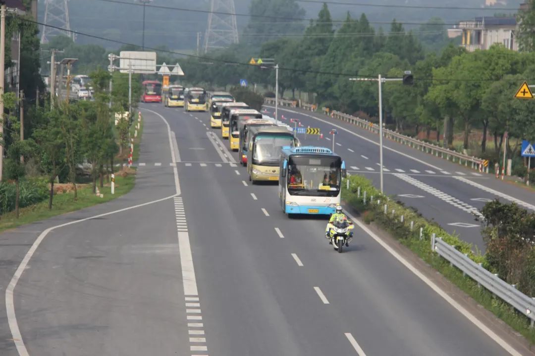 在交警、铁骑们的护送下,载着362位学生的衢州江山市第五中学送考车队驶向高考之路,交警与学校保卫处联合勘查多条路线,择优选用最畅通的一条。