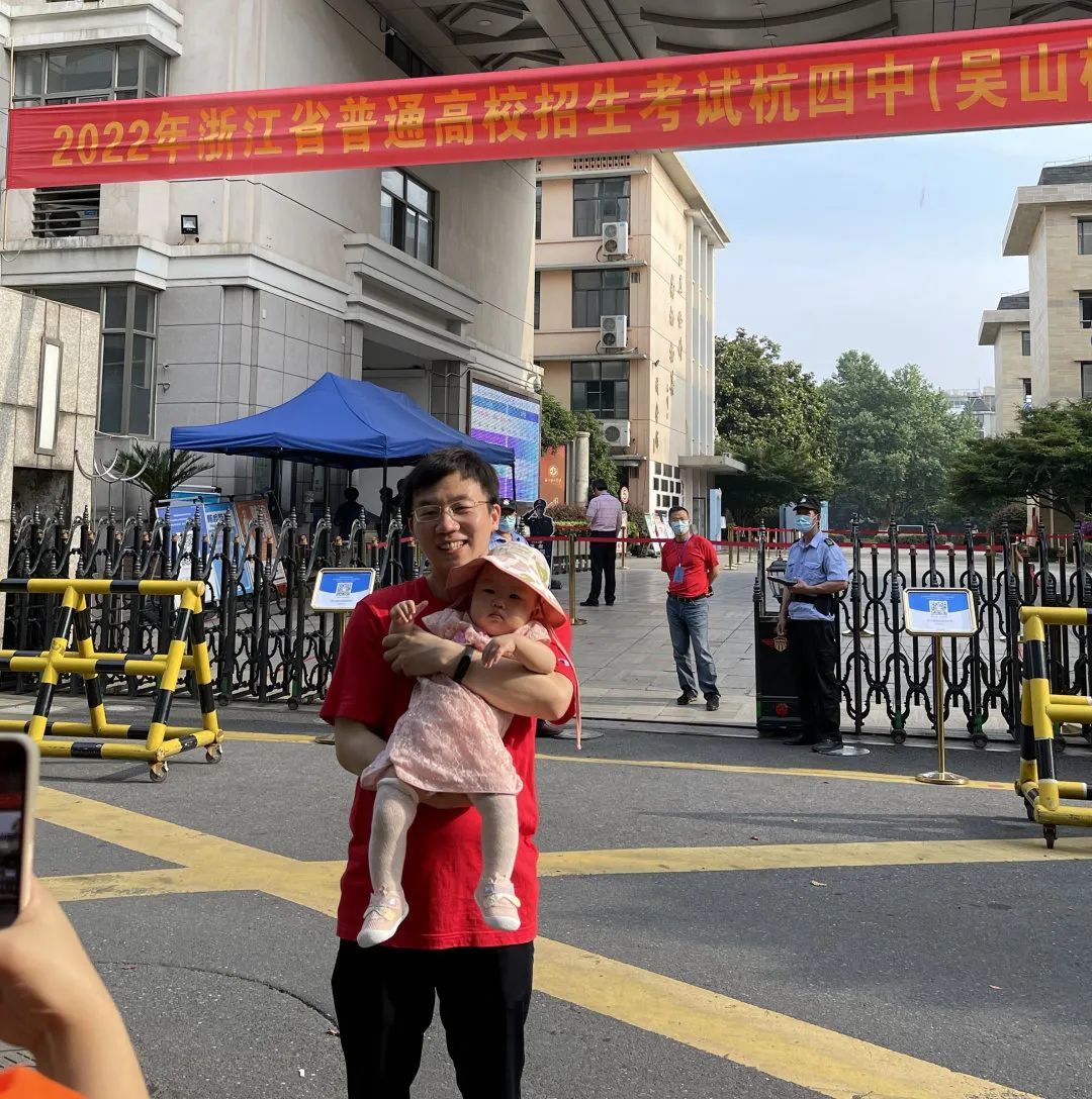 杭州市第四中学(吴山校区)考点前,老师带着14个月大的宝宝,来给班里的考生们加油。