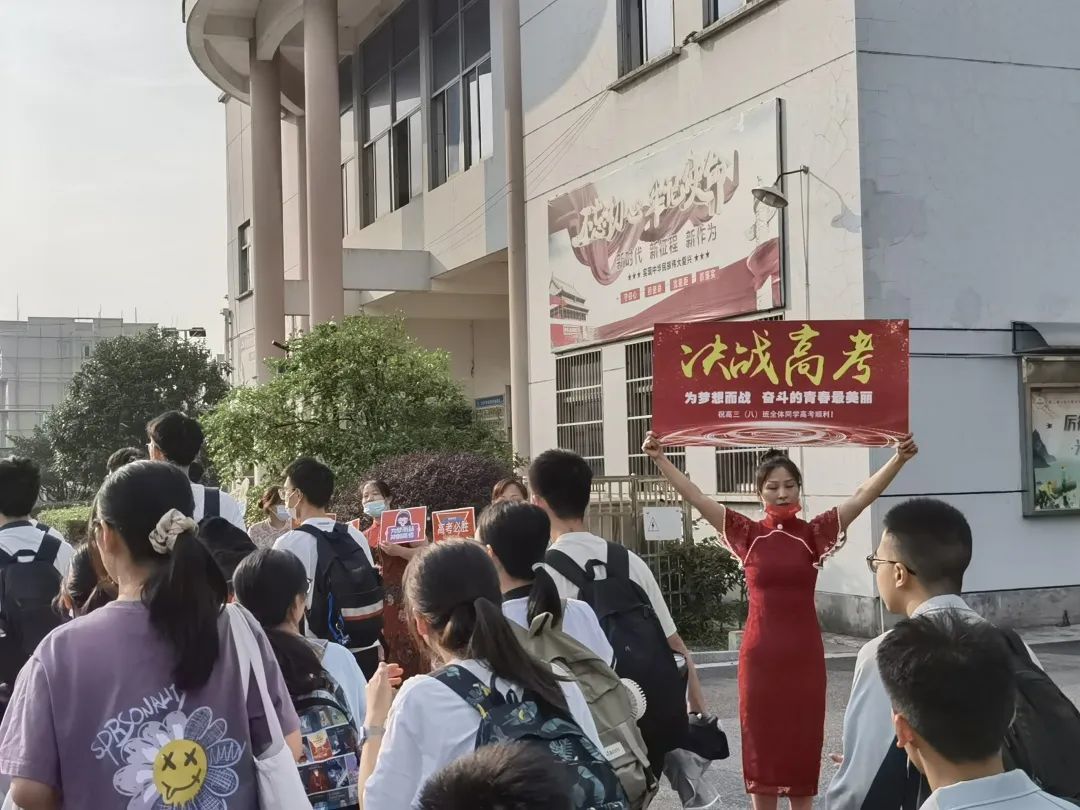 义乌大成中学,家长手举标语,身穿旗袍,夹道而立,为考生加油。
